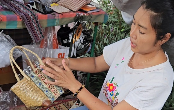 Décoratrice tissus sur sac en jacinthe d’eau (OTOP, province de Khon Kaen) 👤 Portrait de Chotika, artisanat thaïlandais Chotika vit