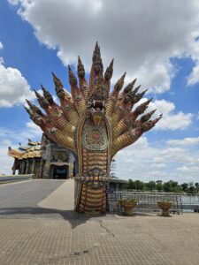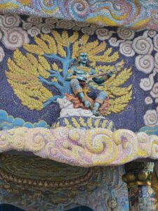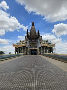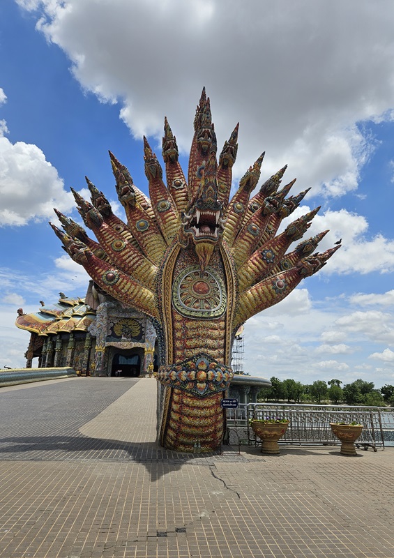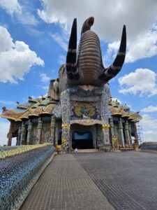 Wat Ban Rai Luang Phor Koon (วัดบ้านไร่ หลวงพ่อคูณ), situé dans la province de Nakhon Ratchasima (Korat), est l’un des temples les plus spectaculaires et uniques de Thaïlande. Il est mondialement connu pour son impressionnante architecture en forme d’éléphant, un symbole de force et de sagesse, recouvert de mosaïques colorées représentant des scènes bouddhistes et mythologiques.