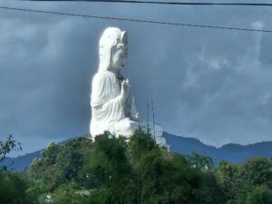 L’une des principales attractions du temple est sa statue colossale de 25 étages, souvent confondue avec un Bouddha géant. Accessible par un ascenseur intérieur, elle offre une vue panoramique sur les environs, renforçant le sentiment d’harmonie et de sérénité. Cette statue représente Guan Yin, une figure centrale du bouddhisme mahayana, vénérée pour sa compassion infinie envers tous les êtres vivants.