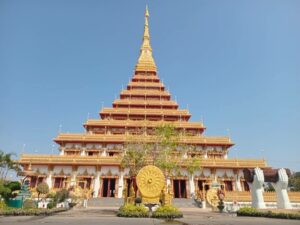 Wat Nong Waeng (วัดหนองแวง) est un temple emblématique situé à Khon Kaen, dans la région de l’Isan, au nord-est de la Thaïlande. Ce temple bouddhiste se distingue par sa structure impressionnante : un stupa à neuf niveaux, appelé Phra Mahathat Kaen Nakhon, qui symbolise les enseignements bouddhistes et les étapes spirituelles vers l’illumination.