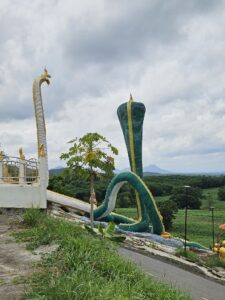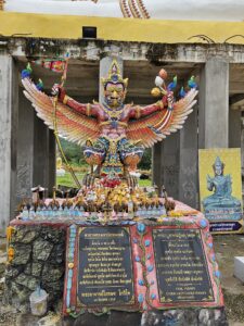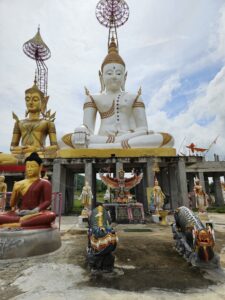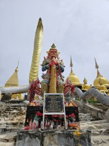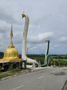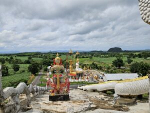 Le temple est particulièrement connu pour son grand Bouddha doré assis, visible de loin, qui semble veiller sur la vallée. L’architecture du site mêle structures modernes et éléments traditionnels, avec des statues de naga protégeant l’accès et des pavillons décorés aux couleurs vives.