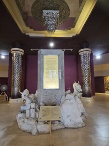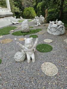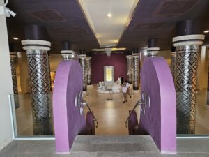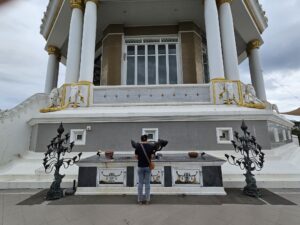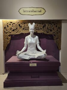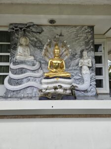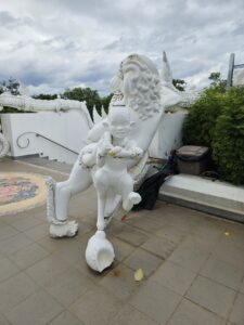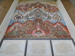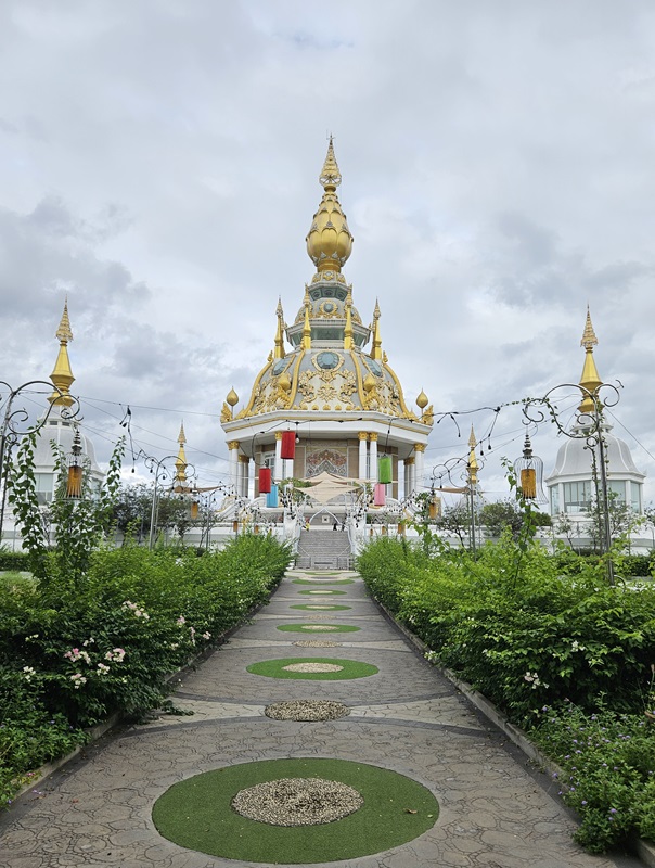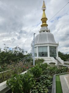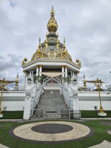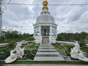 Le point central du temple est son stupa blanc et doré orné de mosaïques de verre et de pierres précieuses, reflétant la lumière du soleil et créant un effet scintillant impressionnant. L’intérieur du stupa est richement décoré de peintures murales illustrant des enseignements bouddhistes et des scènes de la vie du Bouddha, offrant aux visiteurs une immersion à la fois artistique et spirituelle.
